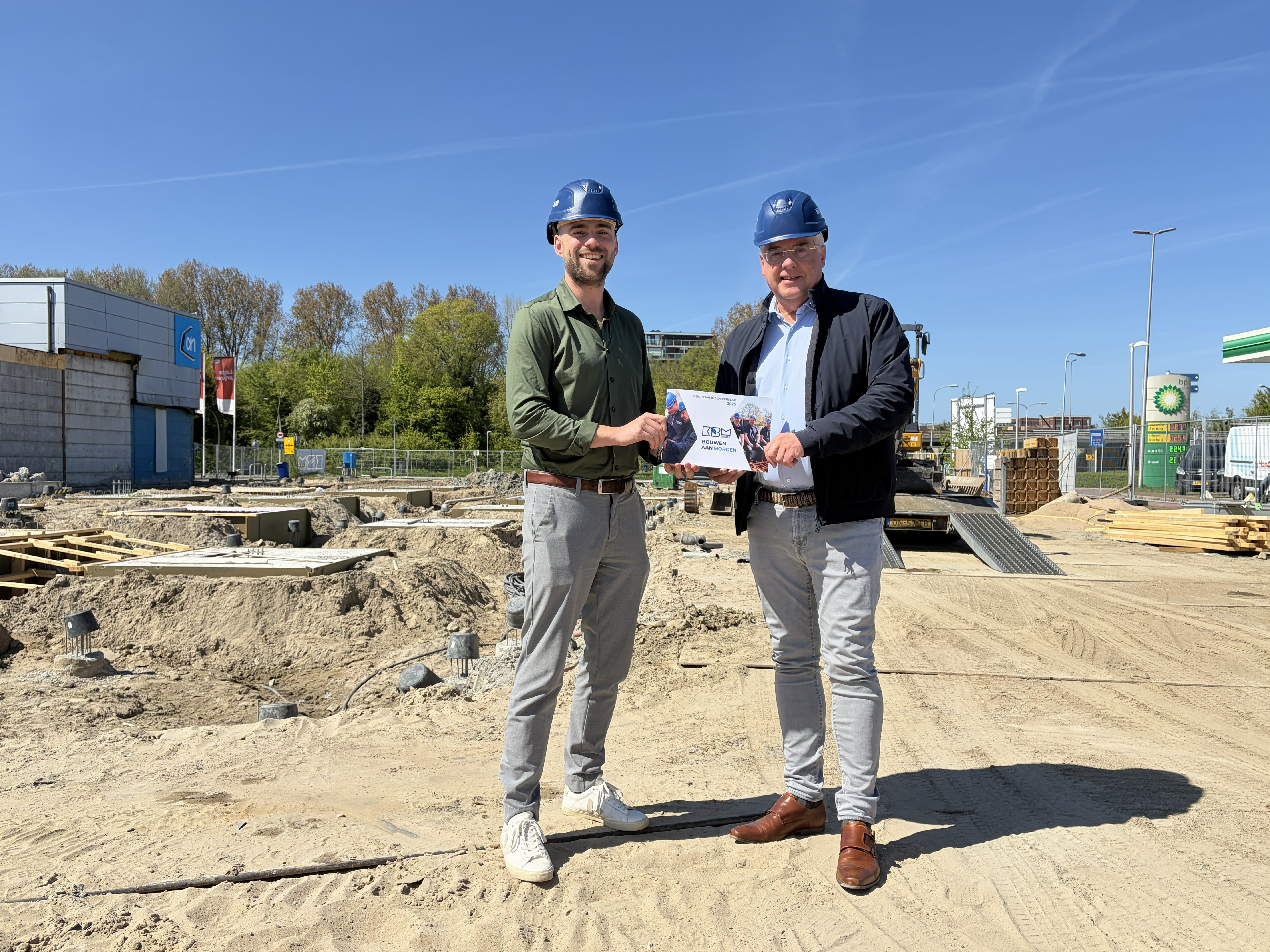 Onder de voorjaarszon werd, op de bouwplaats van ons toekomstig bedrijfsgebouw, het eerste exemplaar van ons Duurzaamheidsverslag 2025 door Bob van Dal (Cooperate Green) overhandigd aan directeur Dick van der Plas.
